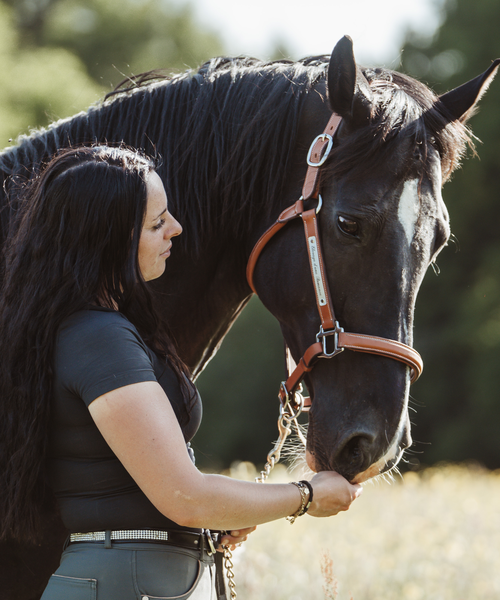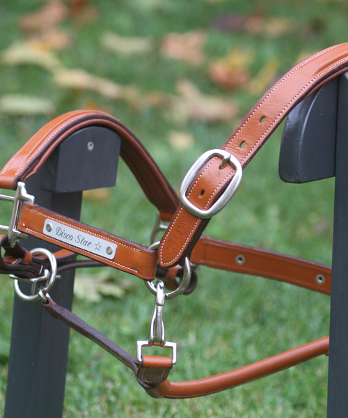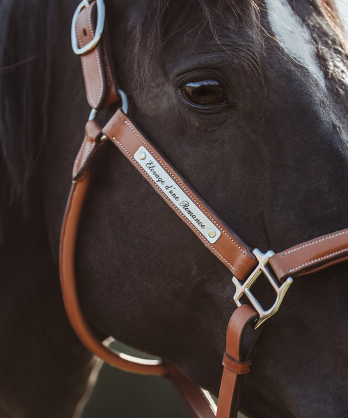 Top Gravures vous propose un licol en cuir, de couleur Cognac, la têtière et la muserolle sont bombées « carré », avec une plaque gravée à personnaliser de votre texte et d’un logo de la race de votre cheval.